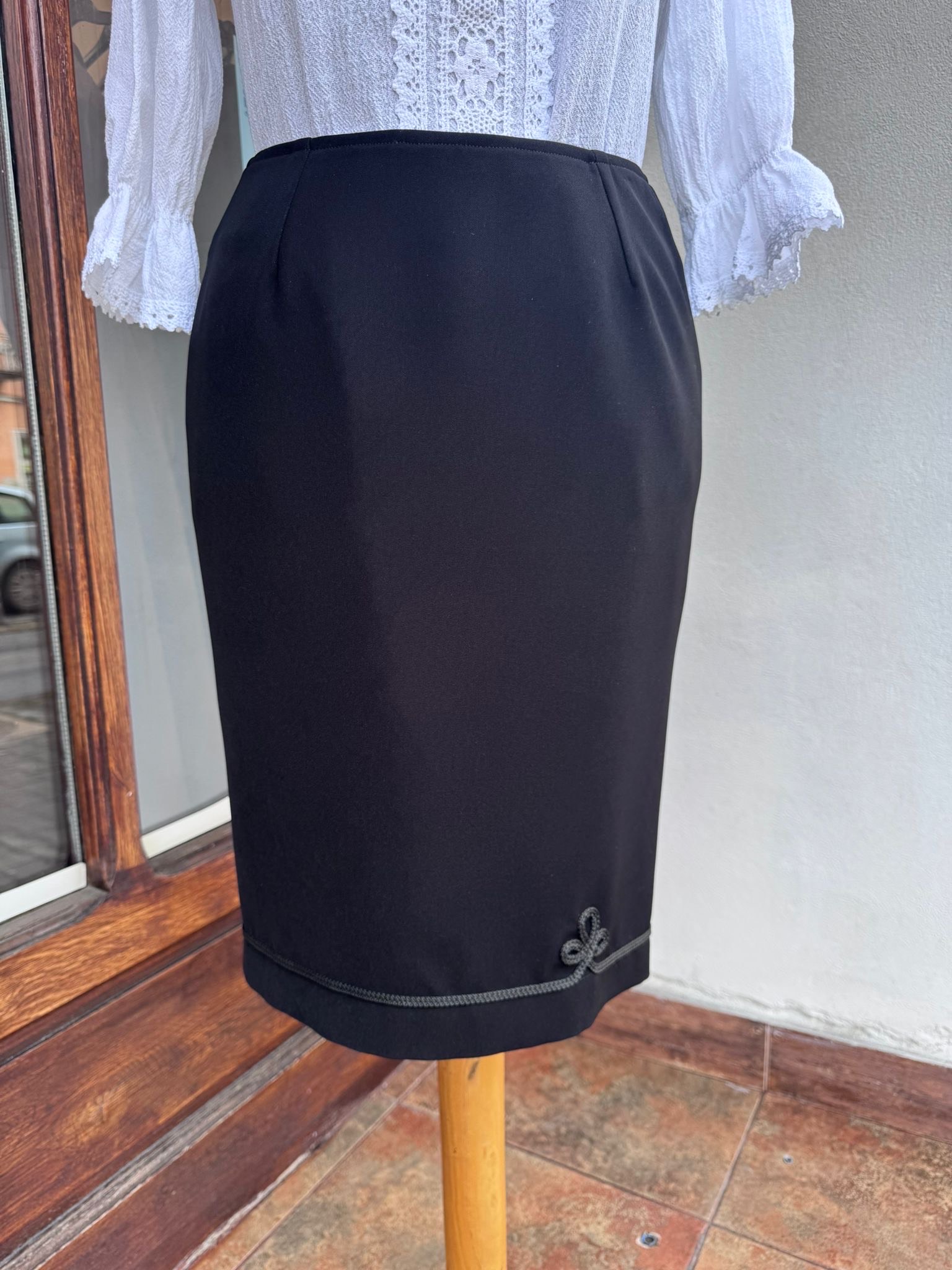 A Helvien Anett modellje egy elegáns, klasszikus, rövid, ceruza típusú szoknya. A női test vonalat követő, térdet takaró hosszúságú darabot az alján diszkrét zsinórozás díszíti és teszi egyedivé.