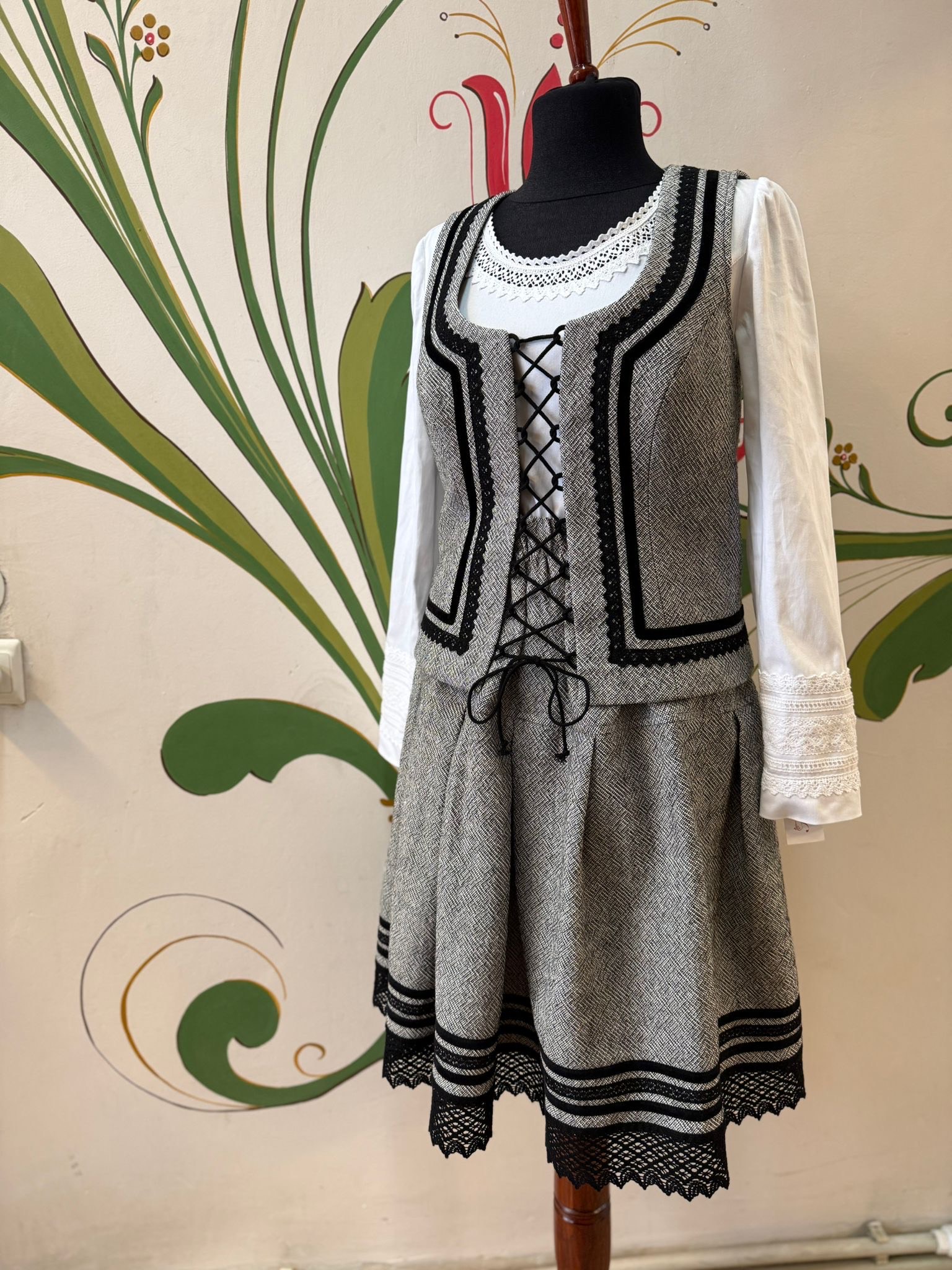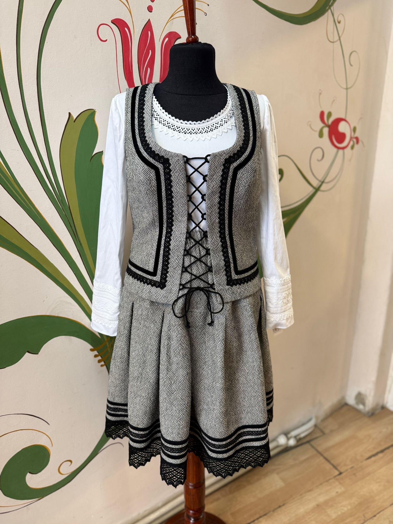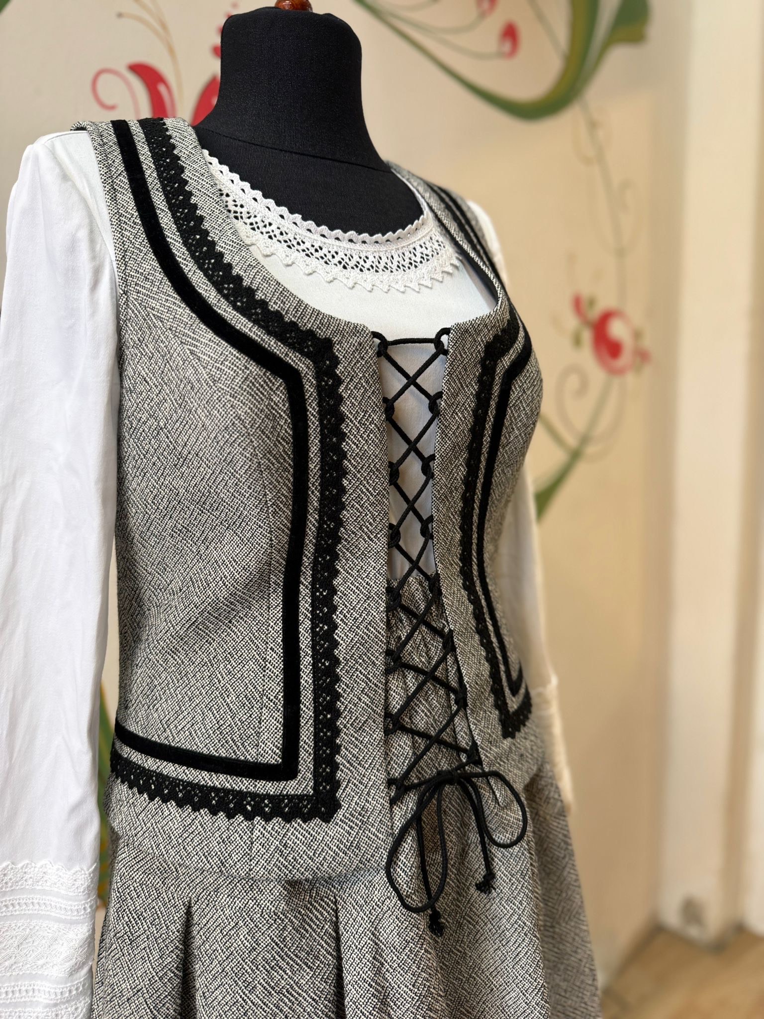 Népviseleti hatású női mellény. Fűzzővel záródik, így nemcsak kényelmes, de praktikus is, hisz nem olyan passzos, mint egy kapcsos/gombos mellény